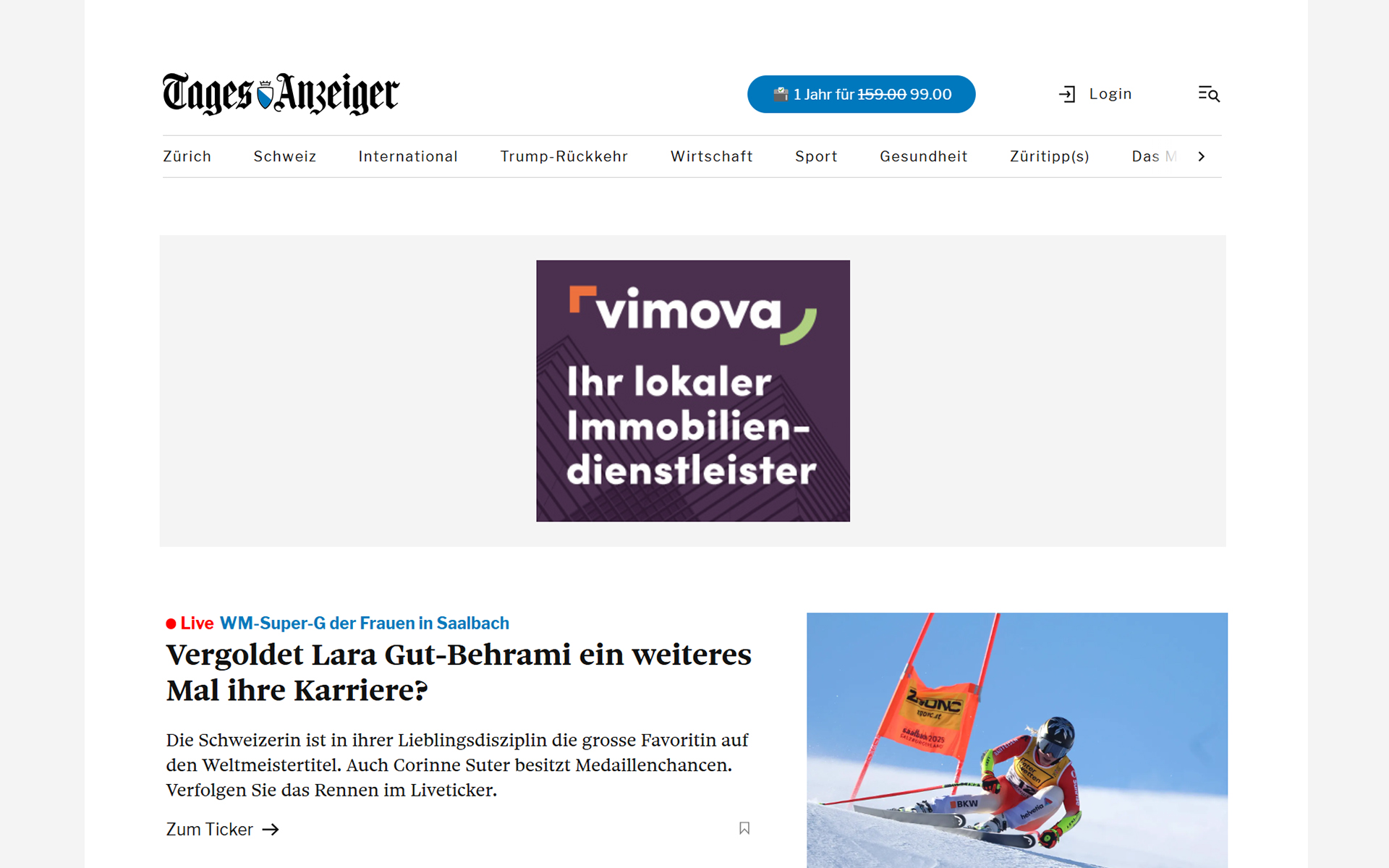 Du möchtest deine Botschaft in der grössten abonnierten Tageszeitung der Schweiz platzieren und die kaufkräftige Metropole Zürich dominieren? Der Tages-Anzeiger (Tagi) wurde im Kanton Zürich gegründet und ist dort tief verankert. Er hat sich zur führenden Regionalzeitung in Zürich entwickelt, die eine starke nationale Ausstrahlung besitzt.