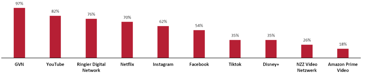 Wie schon in den vergangenen Jahren übertrifft die Reichweite des Goldbach Video Network auch in diesem Jahr die Konkurrenz. Das GVN erreicht bei der werberelevanten Zielgruppe der 15- bis 49-Jährigen mit einer monatlichen Reichweite von 97% mehr Personen als YouTube (82%), das Ringier Digital Network (76%), Netflix (70%) oder Instagram (62%). Die Ergebnisse zeigen, dass das GVN sowohl bei täglicher, wöchentlicher als auch monatlicher Nutzung führend ist.