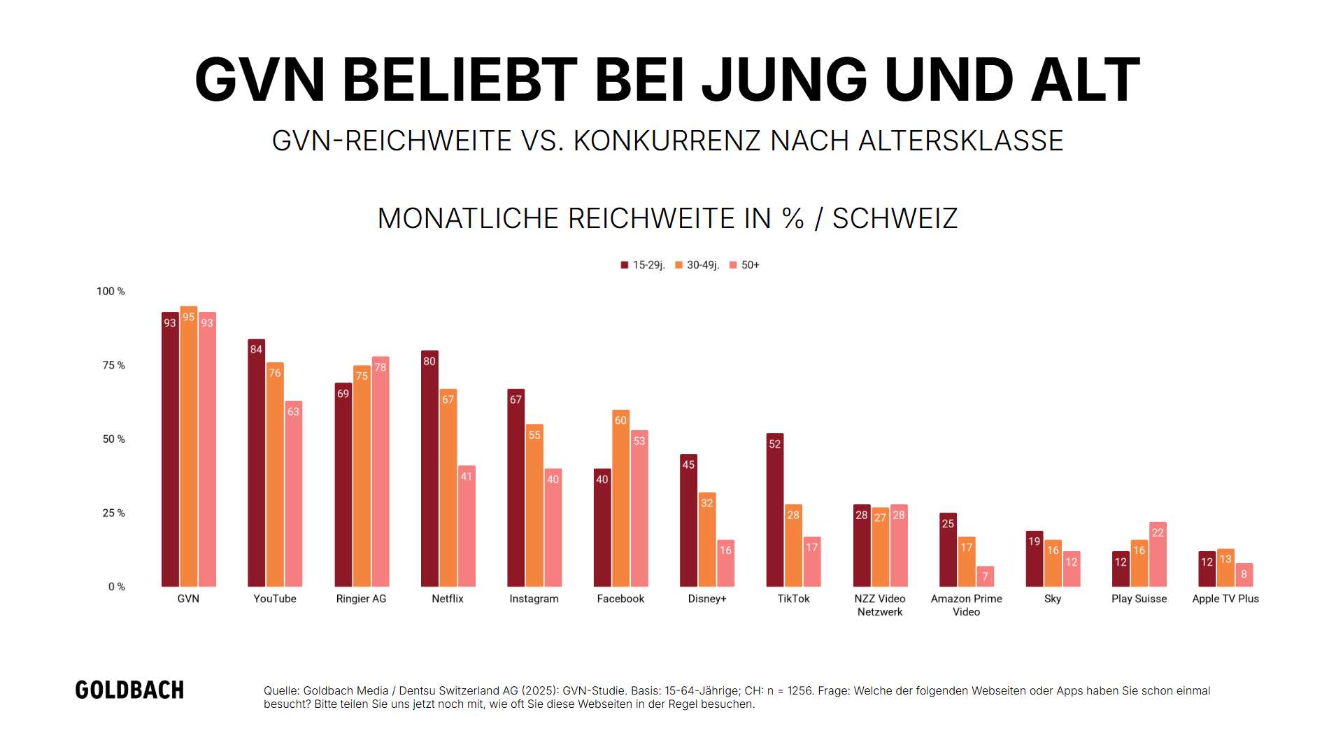 In der Zielgruppe der 15- bis 29-Jährigen erreicht das GVN 93% monatlich. Damit liegt das Netzwerk deutlich vor YouTube mit 84%. Die Daten zeigen, dass das GVN auch bei jüngeren Zielgruppen einen konstant hohen Nutzungsgrad aufweist.