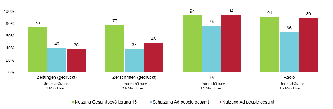 Schauen Sie sich beispielsweise die Unterschiede im Printbereich an (Grafik 1). Ad People nutzen Print nicht nur deutlich weniger, sie unterschätzen die Nutzung bei der Bevölkerung um ganze 39 Prozentpunkte bei Zeitschriften resp. 35 Prozentpunkte bei den Zeitungen. Gemünzt auf die Bevölkerung könnte man also sagen, die Profis unterschätzen die Printnutzung um ca. 2.6 Mio. Nutzerinnen und Nutzer. Beim Radio um ca. 1.7 Mio. Nutzerinnen und Nutzer (25 Prozentpunkte) und beim TV noch um ca. 1.1 Mio (17 Prozentpunkte).