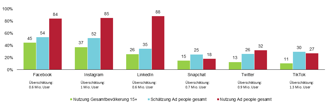 Das umgekehrte Bild zeigt sich bei den neueren Medien (Grafik 2). Möglicherweise ist es Ihnen bei Ihrer Schätzung oben genauso ergangen, aber die Ad People in der Studie überschätzten die allgemeine Nutzung von Social Media in praktisch allen Fällen. Bei TikTok sind es 19 Prozentpunkte (ca. 1 Mio. Nutzerinnen und Nutzer), bei Instagram 15 Prozentpunkte (1 Mio.) und bei LinkedIn 9 Prozentpunkte (ca. 600 000). Besonders auffällig hier: Ad People schätzen nicht nur die allgemeine Nutzung von Facebook und Co. zu hoch ein, sondern nutzen diese Angebote auch deutlich stärker als die Bevölkerung.