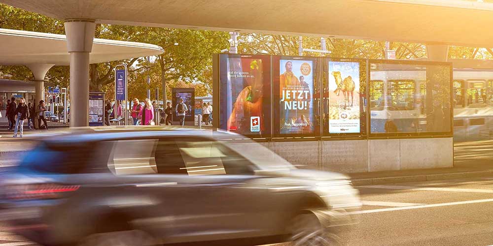 Les gens sont en déplacement : sur le chemin du travail, en faisant du shopping et pendant leurs loisirs. Pour que votre Werbebotschaft soit vue par tous les groupes cibles, notre offre OOH (Out of Home) couvre des milliers de Werbeflächen dans toute la Suisse. Cela comprend, entre autres, des affiches classiques, des écrans et des Sonderwerbeformen tels que des mégaposters. Outre les zones urbaines et les villes très fréquentées telles que Zurich, Genève, Berne, Bâle, Lucerne, Winterthour, Saint-Gall, Lausanne ou Locarno, vous pouvez également placer votre publicité extérieure chez nous dans les aéroports de Genève, Bâle, Berne-Belp et Zurich. À cela s’ajoutent les stations-service et diverses possibilités directement sur le point de vente. Ainsi, vous atteignez chaque semaine des millions de personnes avec votre Werbebotschaft.